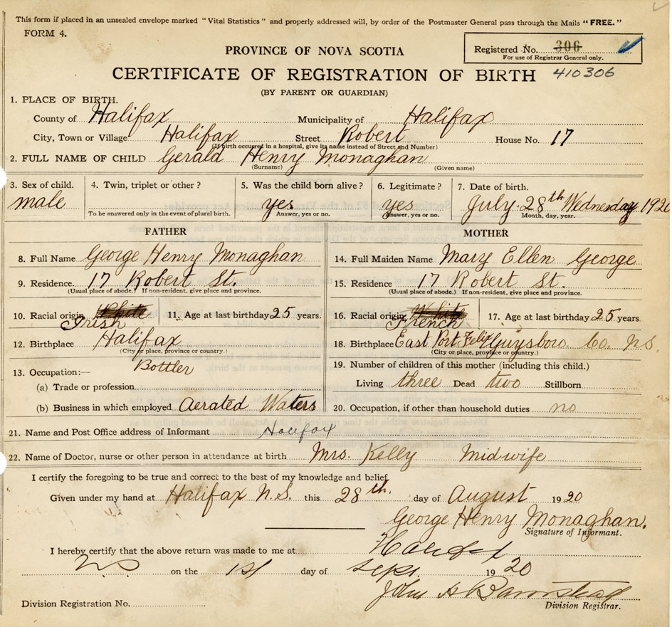 21. Name and Post Office address of Informant George Henry Monaghan Halifax