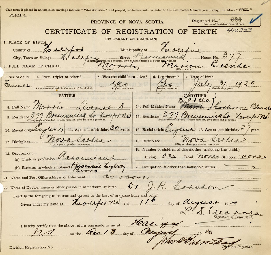 21. Name and Post Office address of Informant L. D. Morris 377 Brunswick St., Halifax