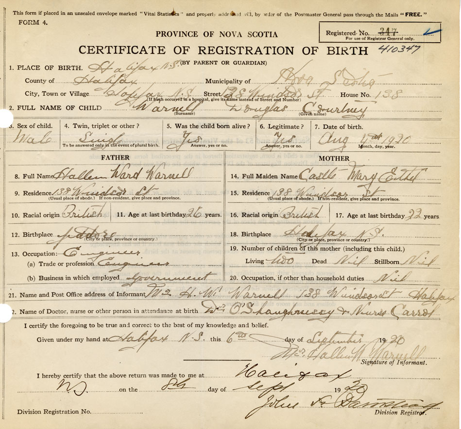 21. Name and Post Office address of Informant Mr. H. W. Warnell 138 Windsor St., Halifax
