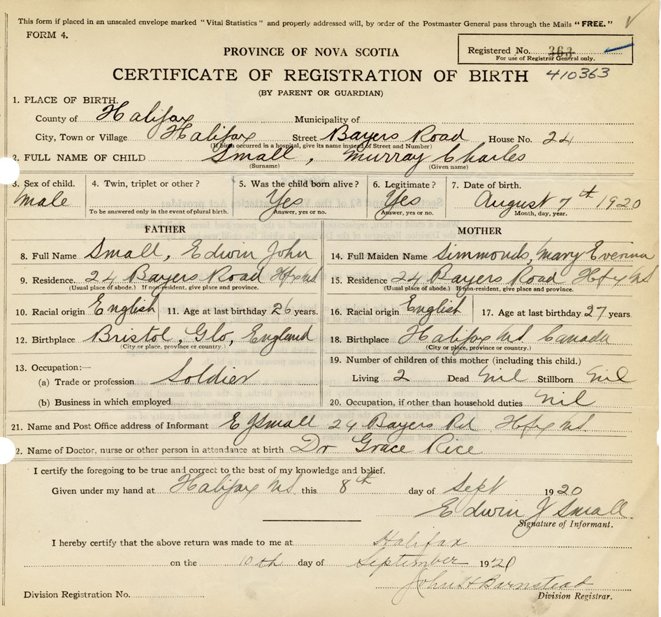 21. Name and Post Office address of Informant E . J. Small 24 Bayers Road, Halifax