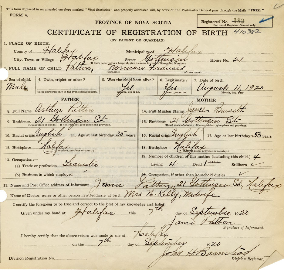 21. Name and Post Office address of Informant Janie Patton 21 Gottingen St., Halifax