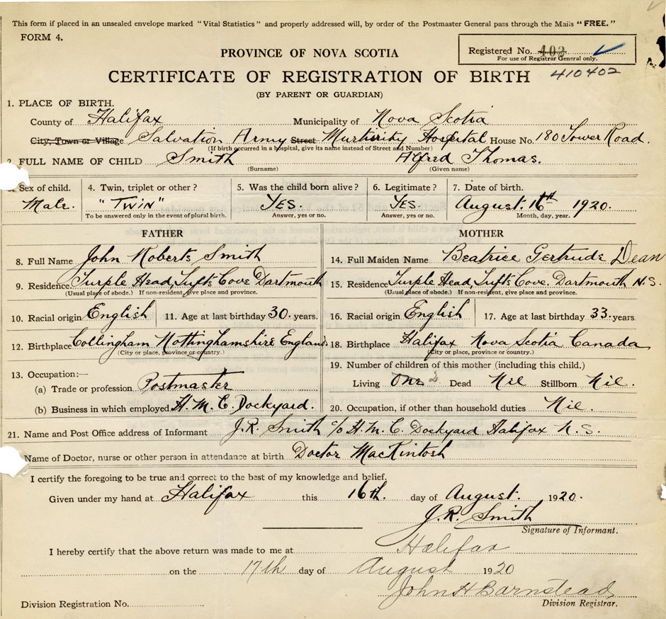 21. Name and Post Office address of Informant J. R. Smith H.M.C. Dockyard, Halifax