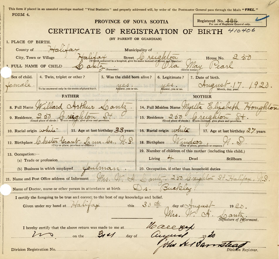21. Name and Post Office address of Informant Mrs. W. A. Lantz 250 Creighton St., Halifax