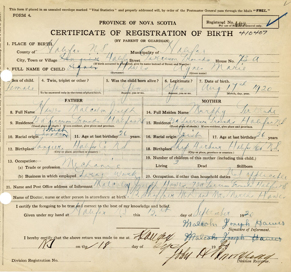 21. Name and Post Office address of Informant Malcolm Joseph Hawes 73 A Garrison Grounds, Halifax