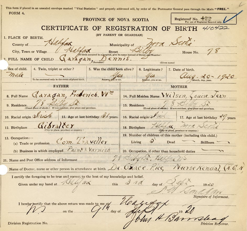 21. Name and Post Office address of Informant F. W. Garagan 78 Bilby St., Halifax