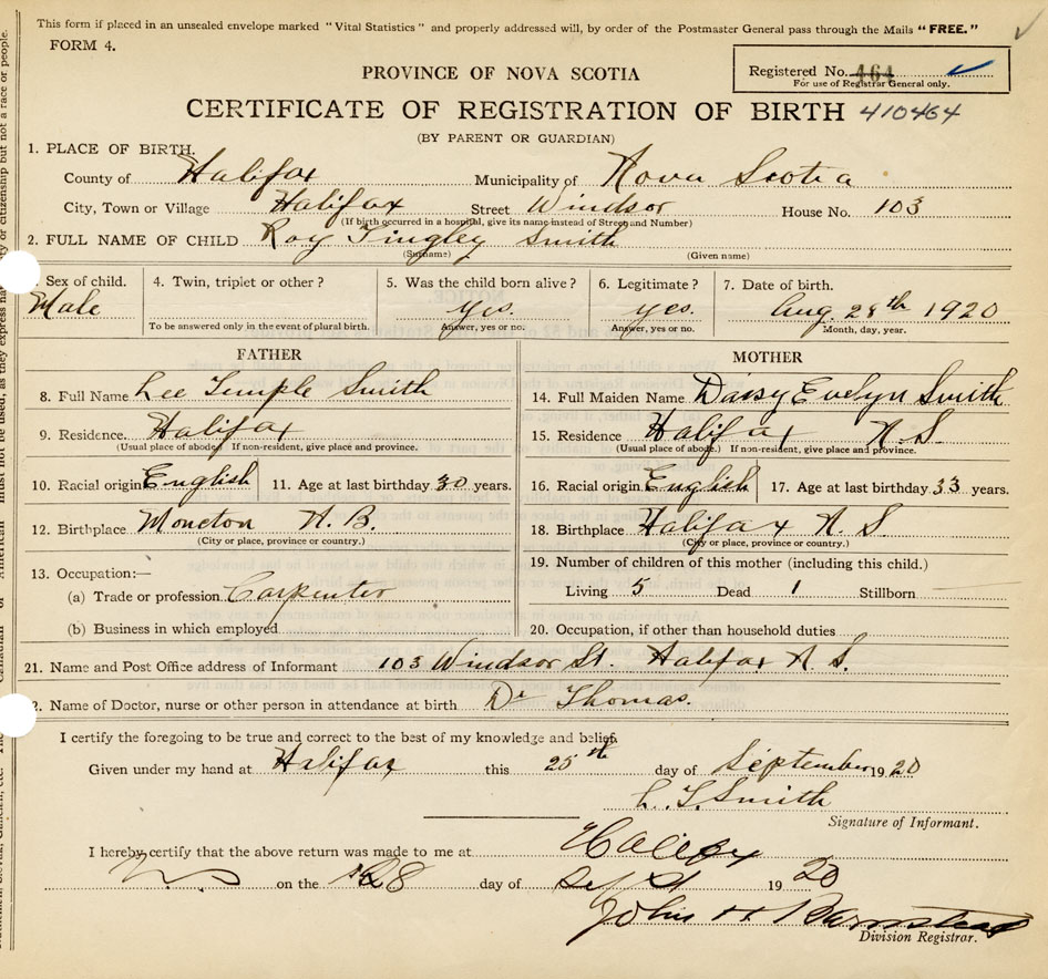 21. Name and Post Office address of Informant L. T. Smith 103 Windsor St., Halifax