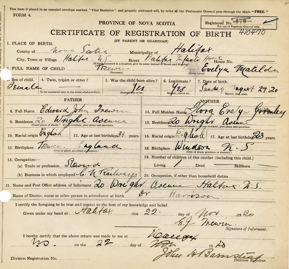 21. Name and Post Office address of Informant E. J. Trewin 20 Wright Avenue, Halifax