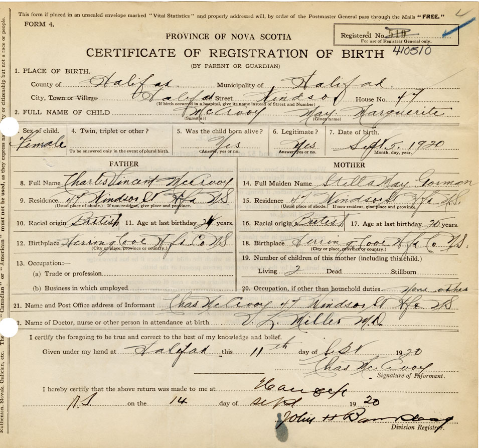21. Name and Post Office address of Informant Chas. McAvoy 47 Windsor St., Halifax