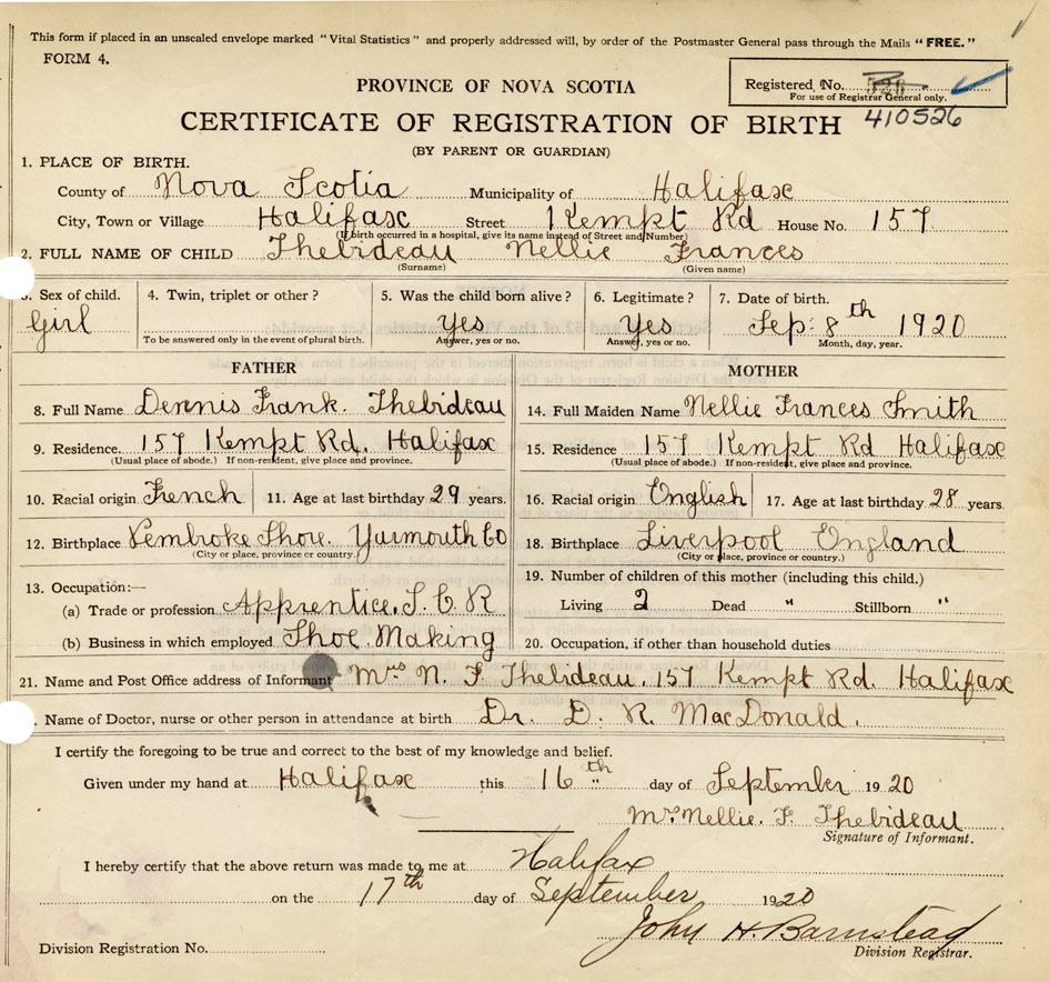 21. Name and Post Office address of Informant Mrs N. F. Thebideau 157 Kempt Rd., Halifax