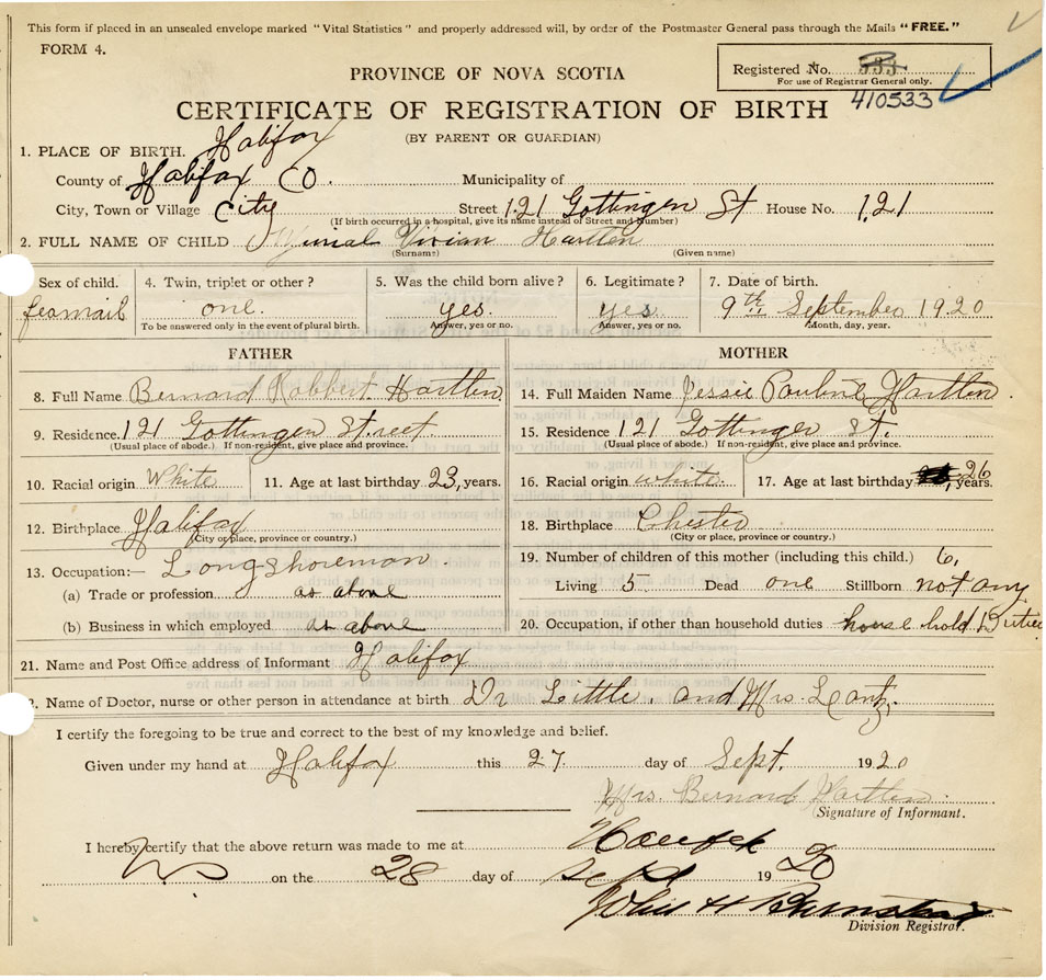 21. Name and Post Office address of Informant Mrs. Bernard Hartlen Halifax