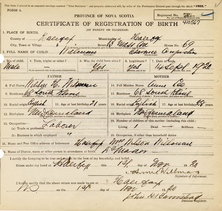 21. Name and Post Office address of Informant Mrs. Wilson Willman Halifax