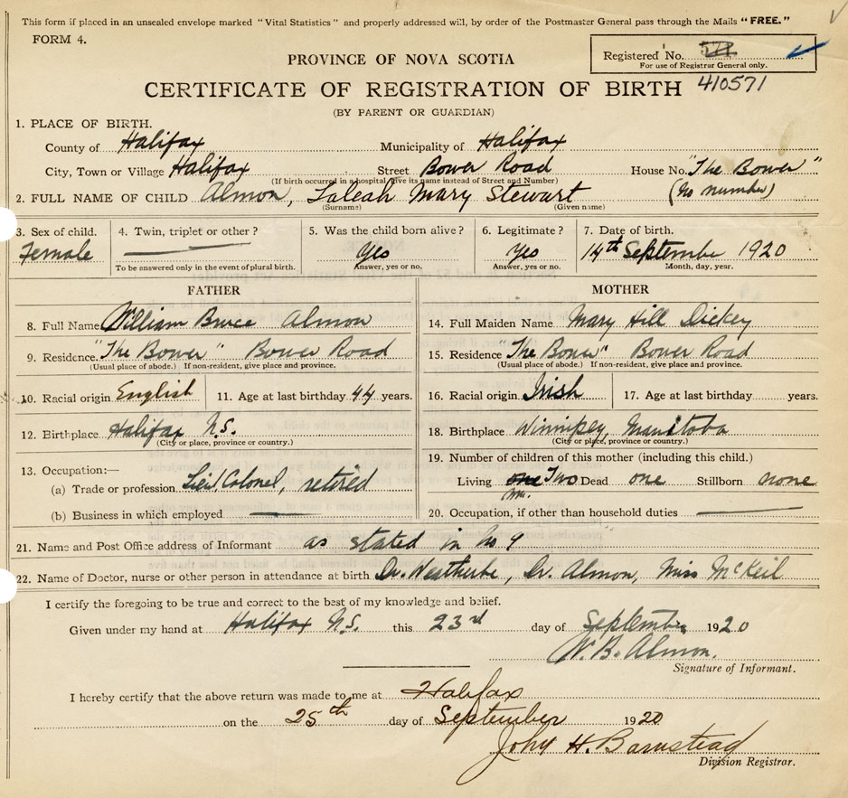 22. Name of Doctor, nurse or other person in attendance at birth Dr. Weatherbe, Dr. Almon, Miss McKeil