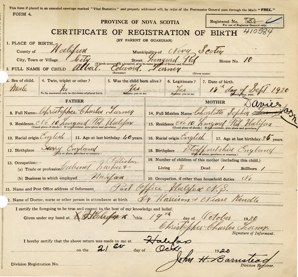 21. Name and Post Office address of Informant Christopher Charles Turner. Post Office, Halifax N.S.