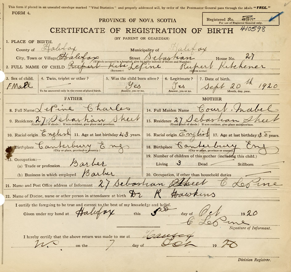 2. FULL NAME OF CHILD LePine, Rupert Kitchener