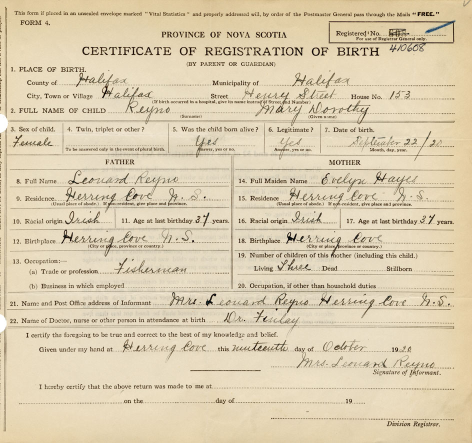 21. Name and Post Office address of Informant Mrs. Leonard Reyno Herring Cove