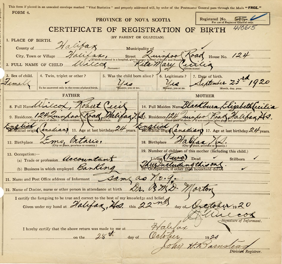 Female Birth Registration: Year: 1920 number: 41000615