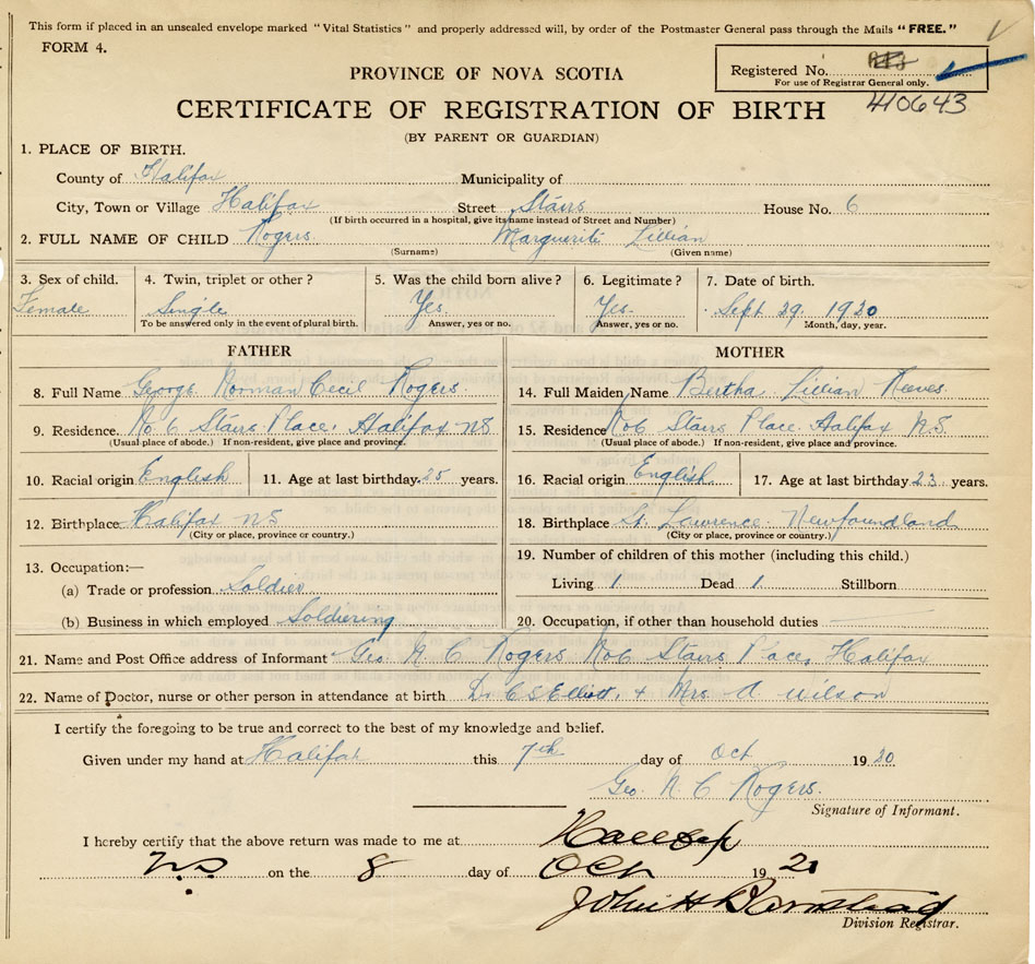 21. Name and Post Office address of Informant Geo. N. C. Rogers No. 6 Stairs Place, Halifax