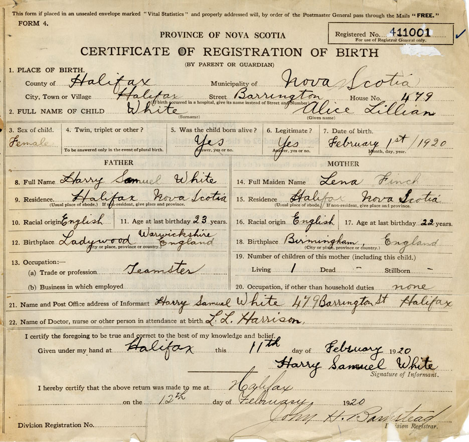 21. Name and Post Office address of Informant Harry Samuel White 479 Barrington St., Halifax