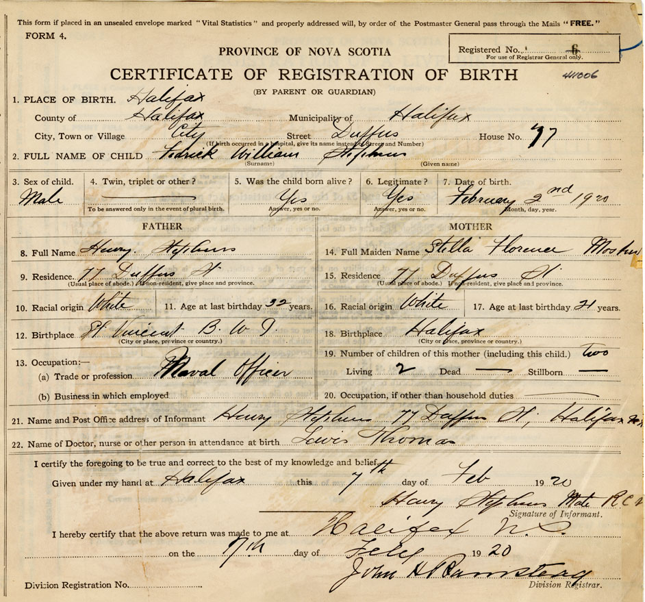21. Name and Post Office address of Informant Henry Stephens 77 Duffus St., Halifax