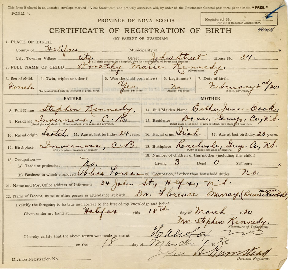 21. Name and Post Office address of Informant Mrs. Stephen Kennedy 34 John St., Hlfx.