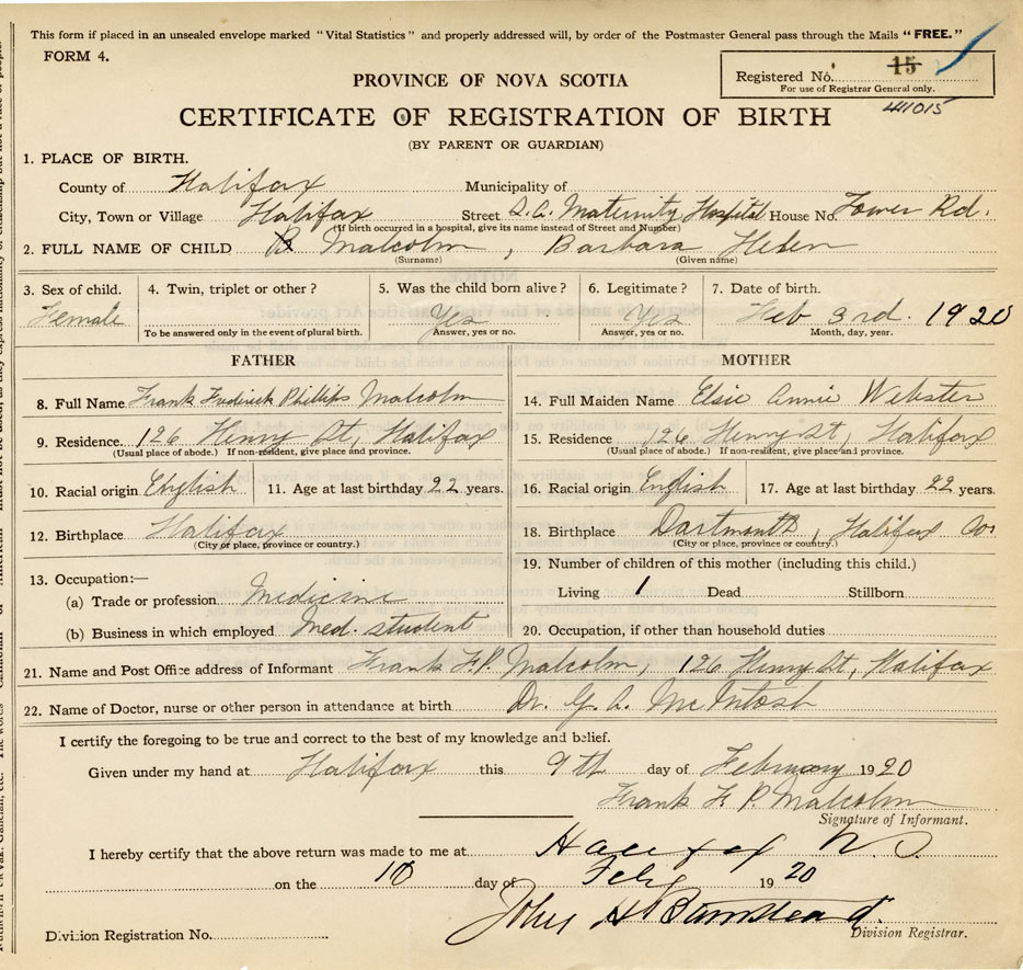 21. Name and Post Office address of Informant Frank F. P. Malcolm 126 Henry St., Halifax