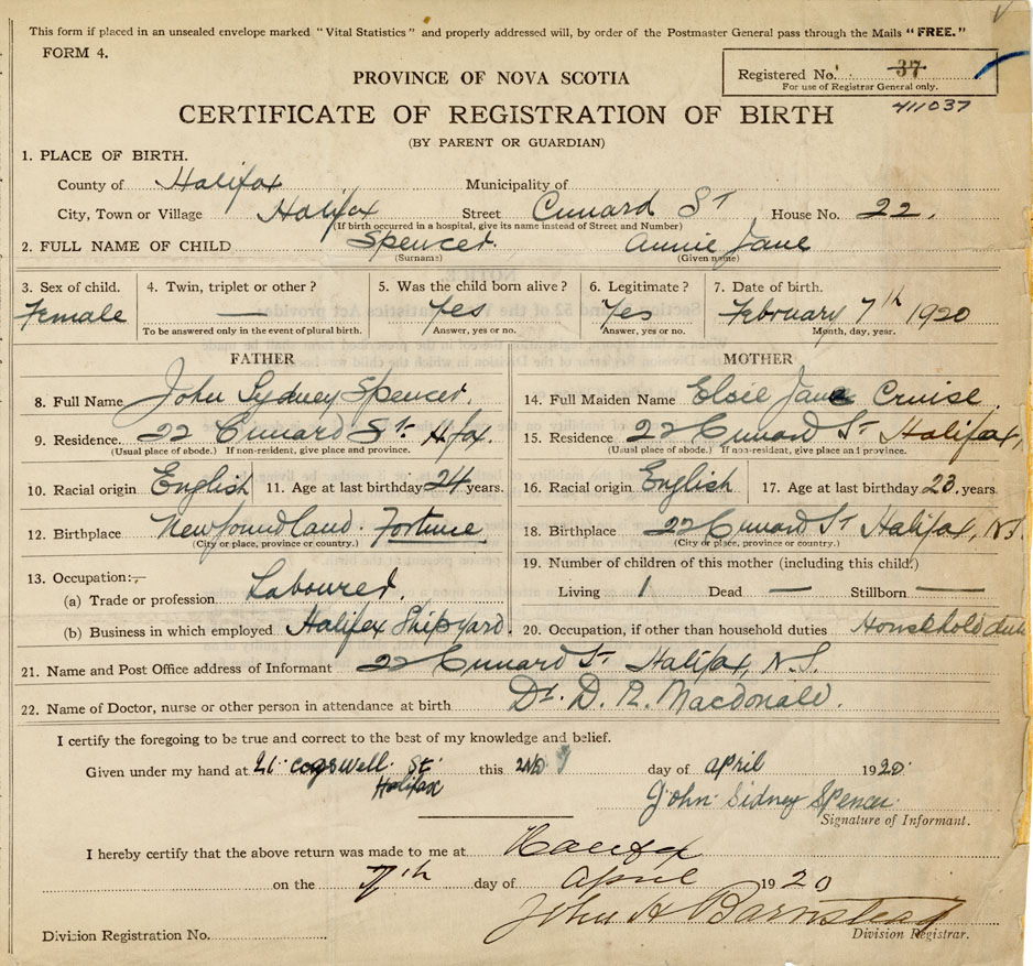 21. Name and Post Office address of Informant John Sidney Spencer 22 Cunard St., Halifax