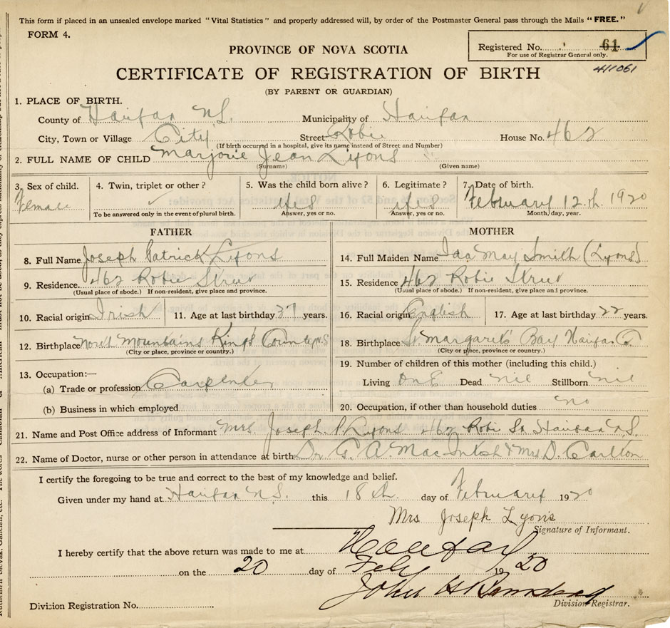 21. Name and Post Office address of Informant Mrs. Joseph Lyons 462 Robie St., Halifax
