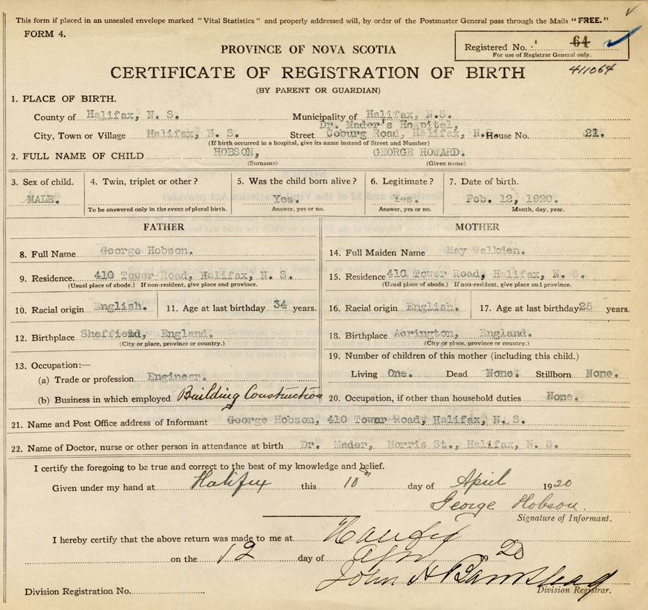 21. Name and Post Office address of Informant George Hobson 410 Tower Road, Halifax