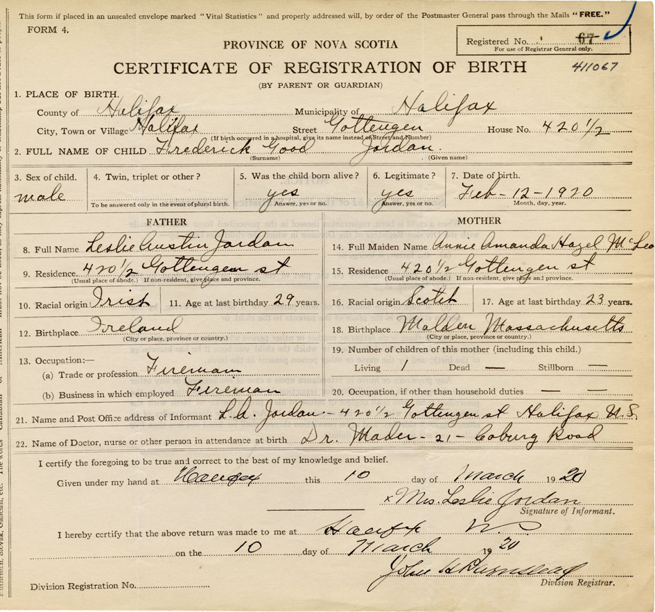 21. Name and Post Office address of Informant L. A. Jordan 420 1/2 Gottingen St., Halifax