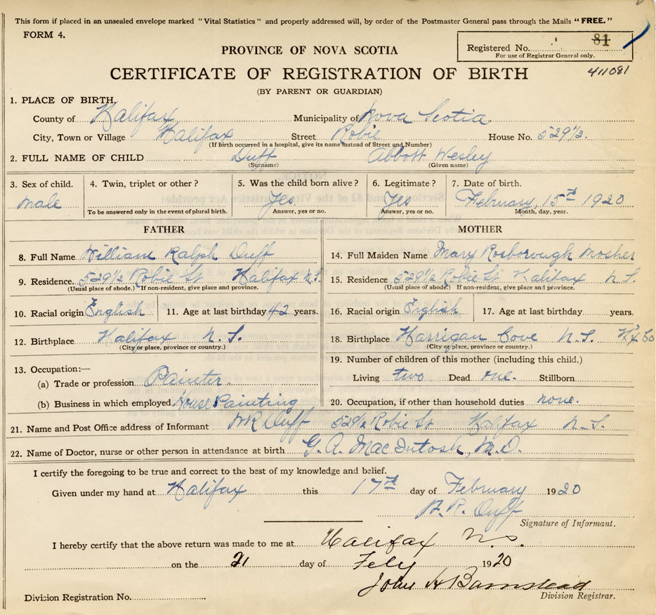 21. Name and Post Office address of Informant M. R. Duff 529 1/2 Robie St., Halifax
