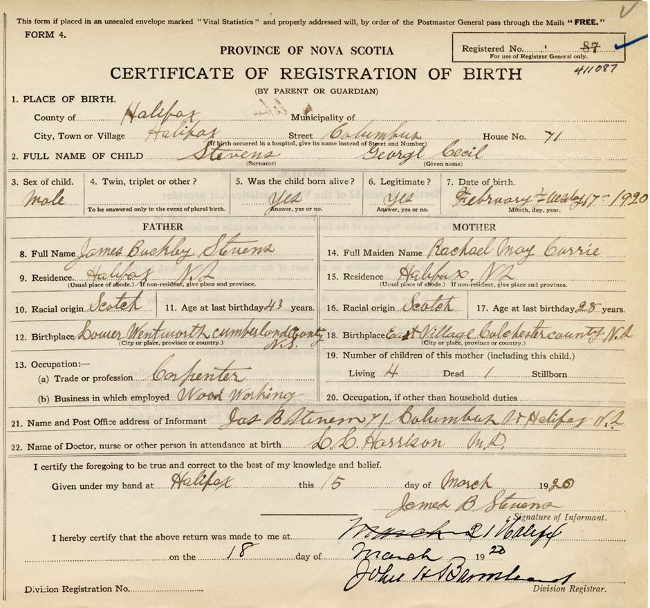 21. Name and Post Office address of Informant Jas. Buckley Stevens 71 Columbus St., Halifax