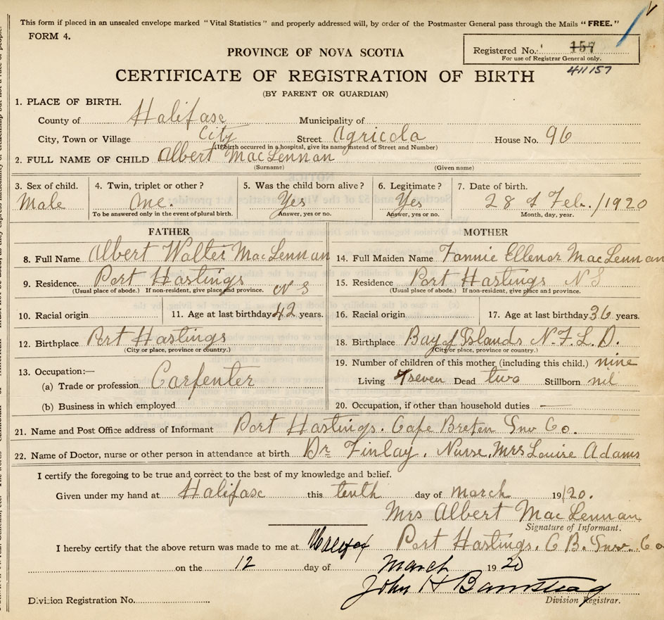 21. Name and Post Office address of Informant Mrs. Albert MacLennan Port Hastings, Cape Breton, Inv, Co,