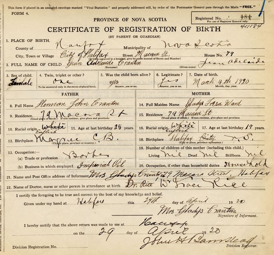 21. Name and Post Office address of Informant Mrs. Gladys Cranton 79 Macara Street, Halifax