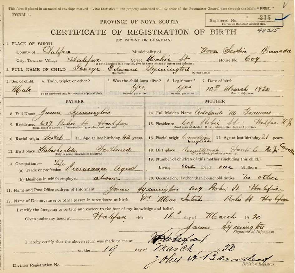 21. Name and Post Office address of Informant James Symington 609 Robie St., Halifax