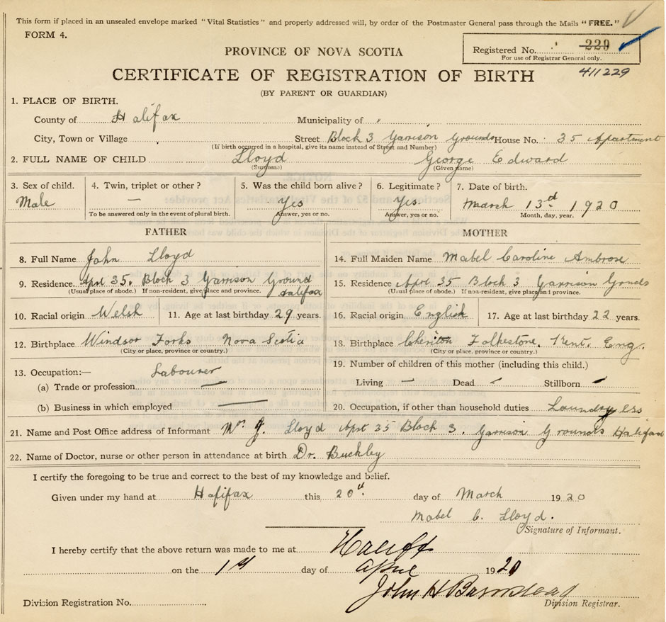 21. Name and Post Office address of Informant Mr. J. Lloyd Apt. 35, Block 3, Garrison Grounds, Halifax