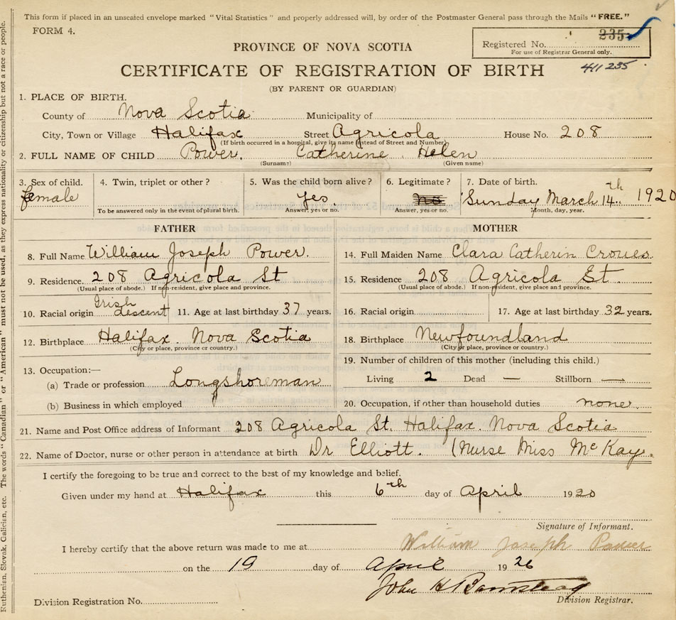 21. Name and Post Office address of Informant William Joseph Powers 208 Agricola St., Halifax