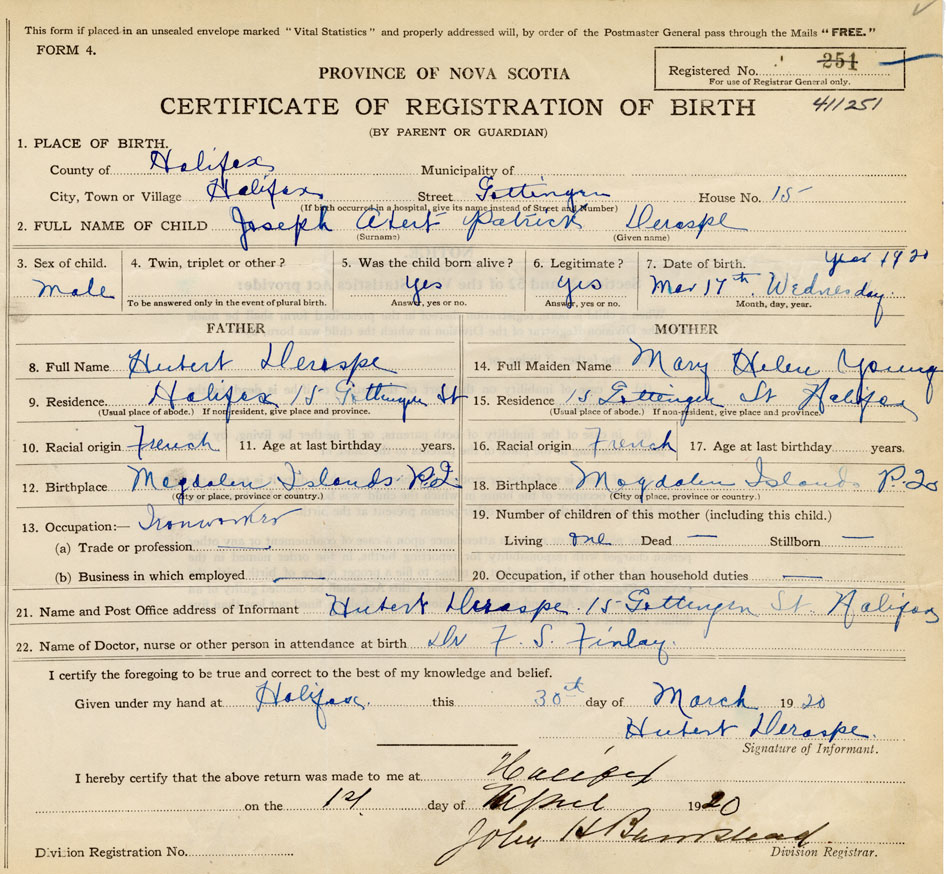 21. Name and Post Office address of Informant Hubert Derospe 15 Gottingen St., Halifax
