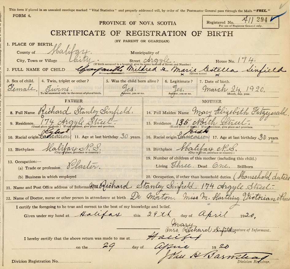 21. Name and Post Office address of Informant Mrs. Richard Stanley Sinfield 174 Argyle Street