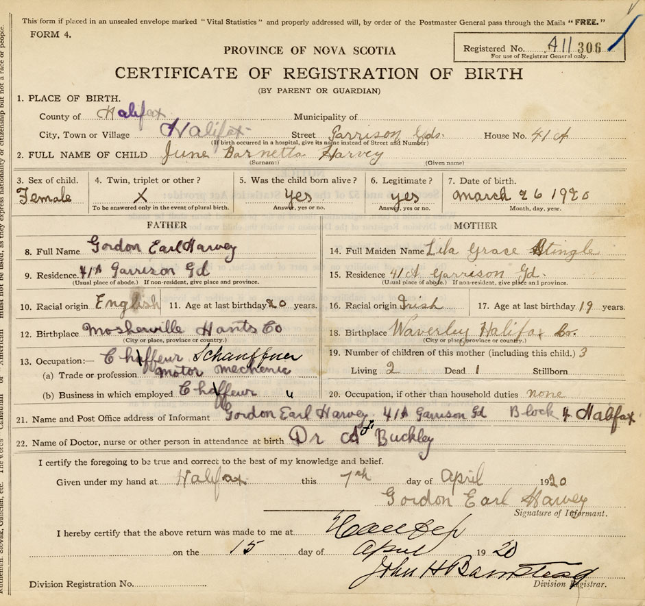 21. Name and Post Office address of Informant Gordon Earl Harvey 41 A Garrison Gd., Block 4, Halifax
