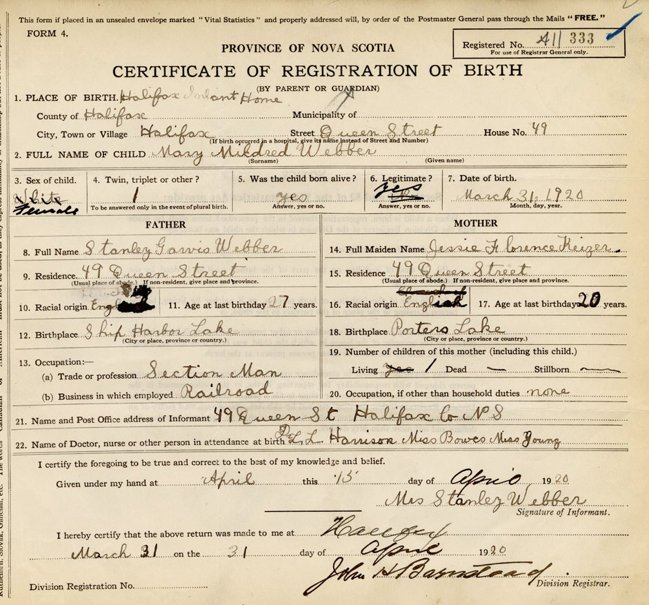 21. Name and Post Office address of Informant Mrs. Stanley Webber 49 Queen St., Halifax Co.
