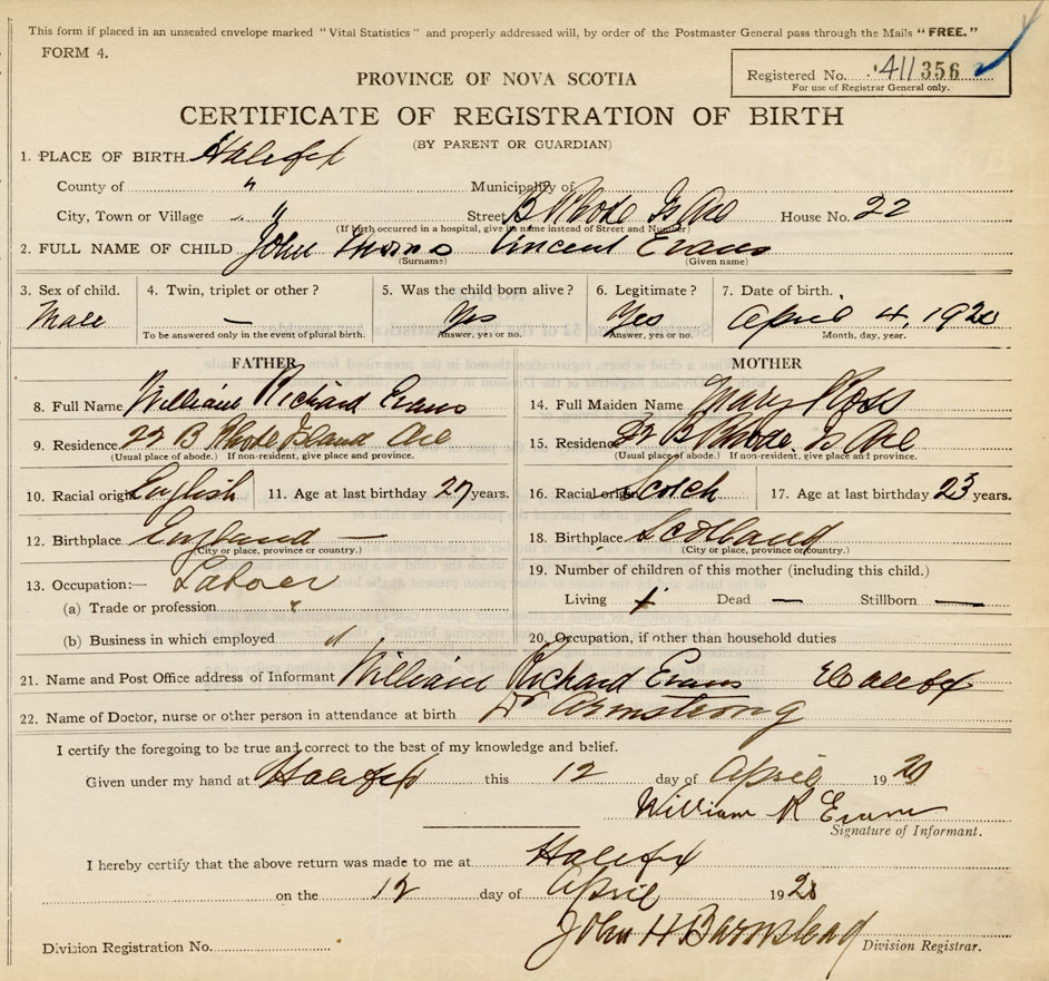 21. Name and Post Office address of Informant William Richard Evans Halifax