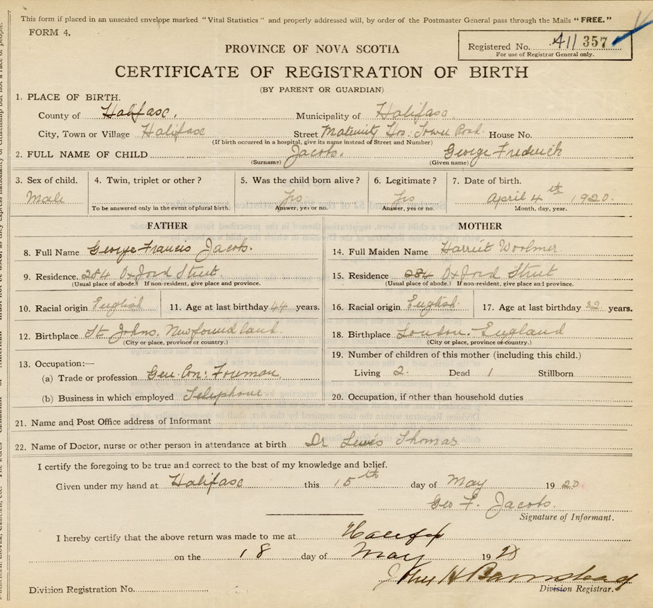 21. Name and Post Office address of Informant Geo. F. Jacob Halifax