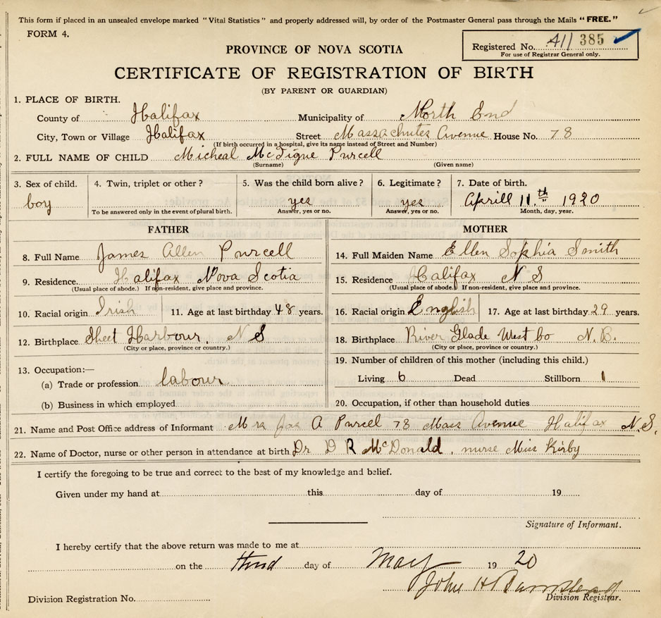 21. Name and Post Office address of Informant Mrs. Jas. A. Purcell 78 Mass. Avenue, Halifax N.S.