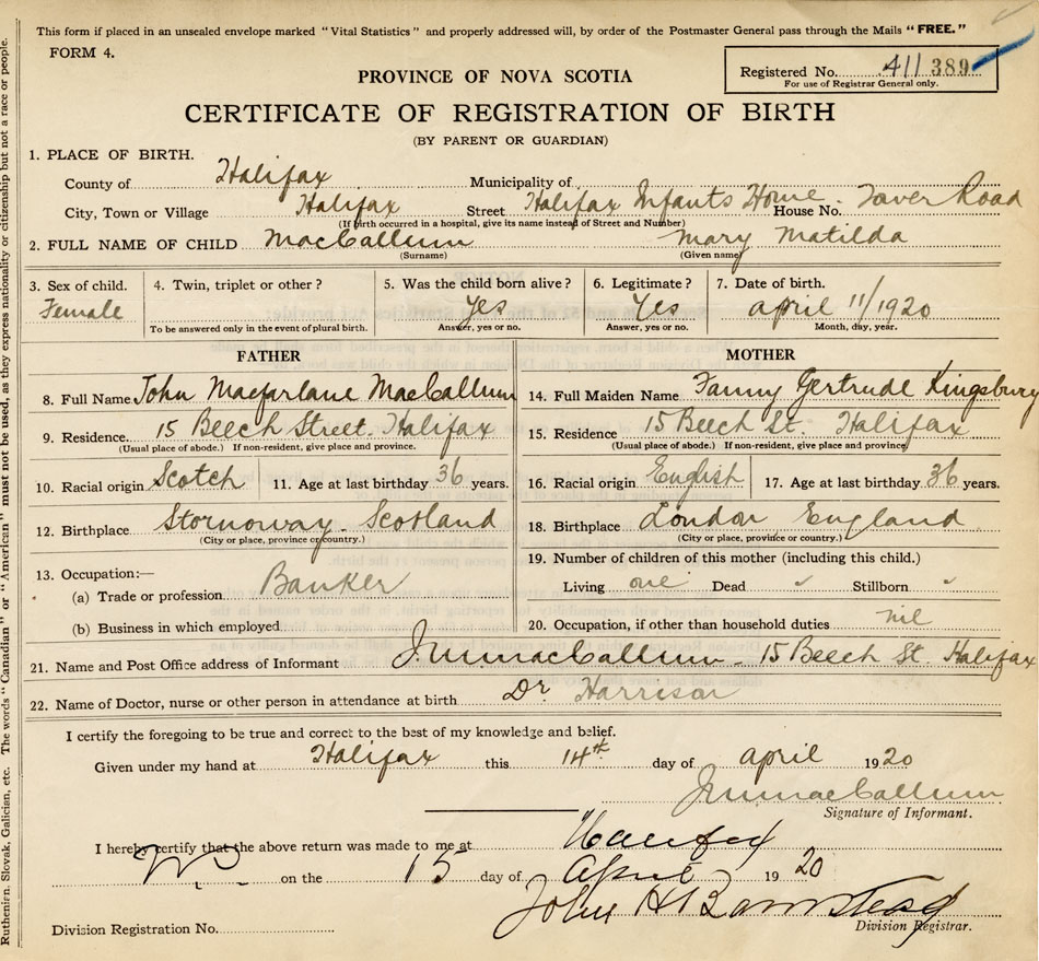 21. Name and Post Office address of Informant J. MacCallum 15 Beech St., Halifax