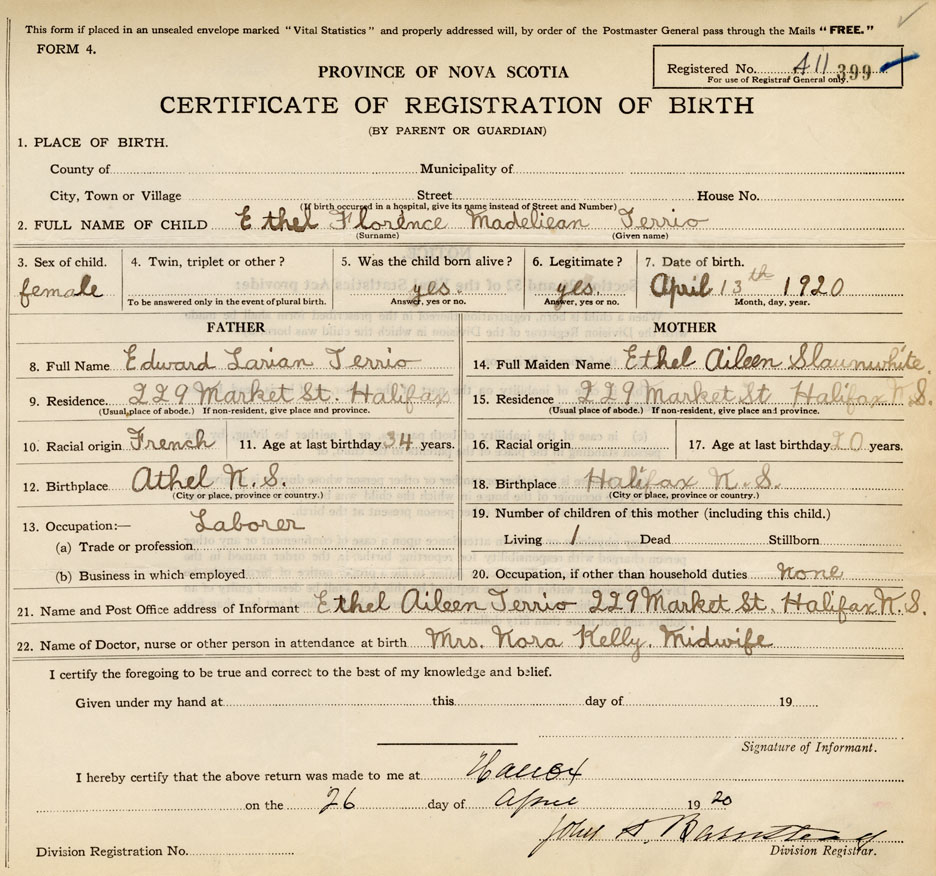 21. Name and Post Office address of Informant Ethel Aileen Terrio 229 Market St., Halifax