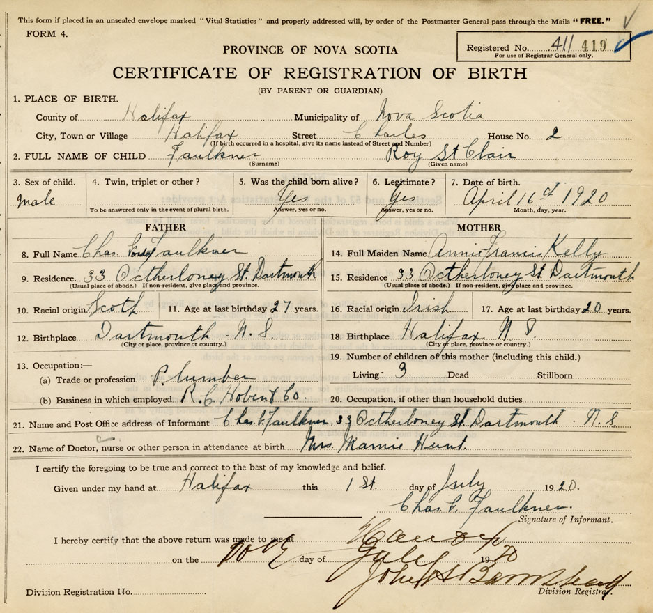 21. Name and Post Office address of Informant Chas. G. Faulkner 33 Ochterloney St., Dartmouth