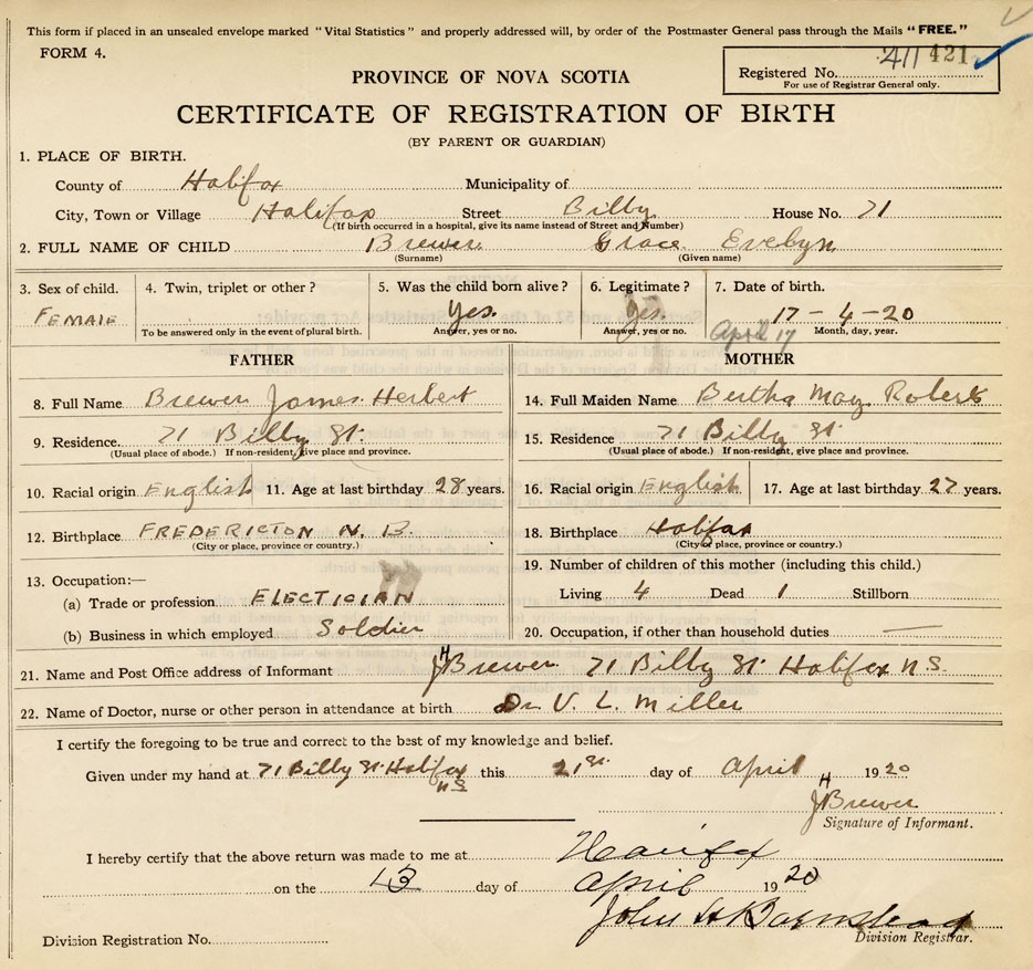 21. Name and Post Office address of Informant J. H. Brewer 71 Bilby St., Halifax