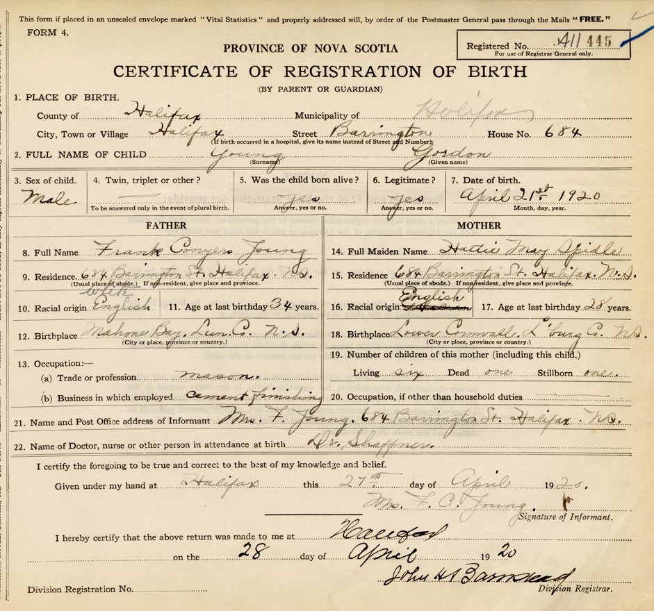 21. Name and Post Office address of Informant Mrs. F. Young 684 Barrington St., Halifax
