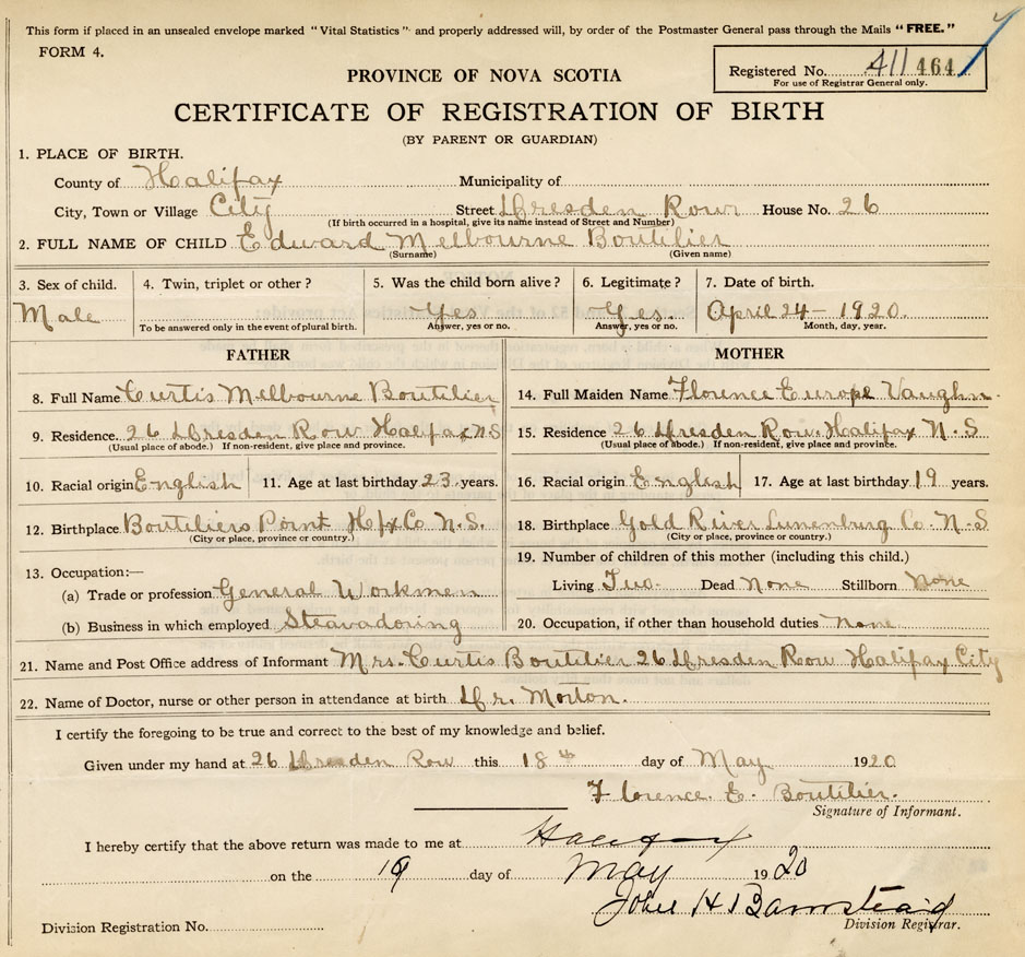 21. Name and Post Office address of Informant Mrs. Curtis Boutilier 26 Dresden Row, Halifax City