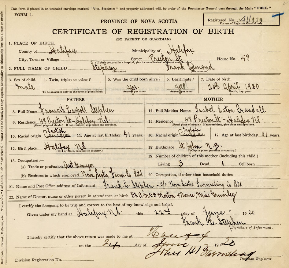 21. Name and Post Office address of Informant Frank L. Stephen c/o Nova Scotia Furnishing Co. Ltd.